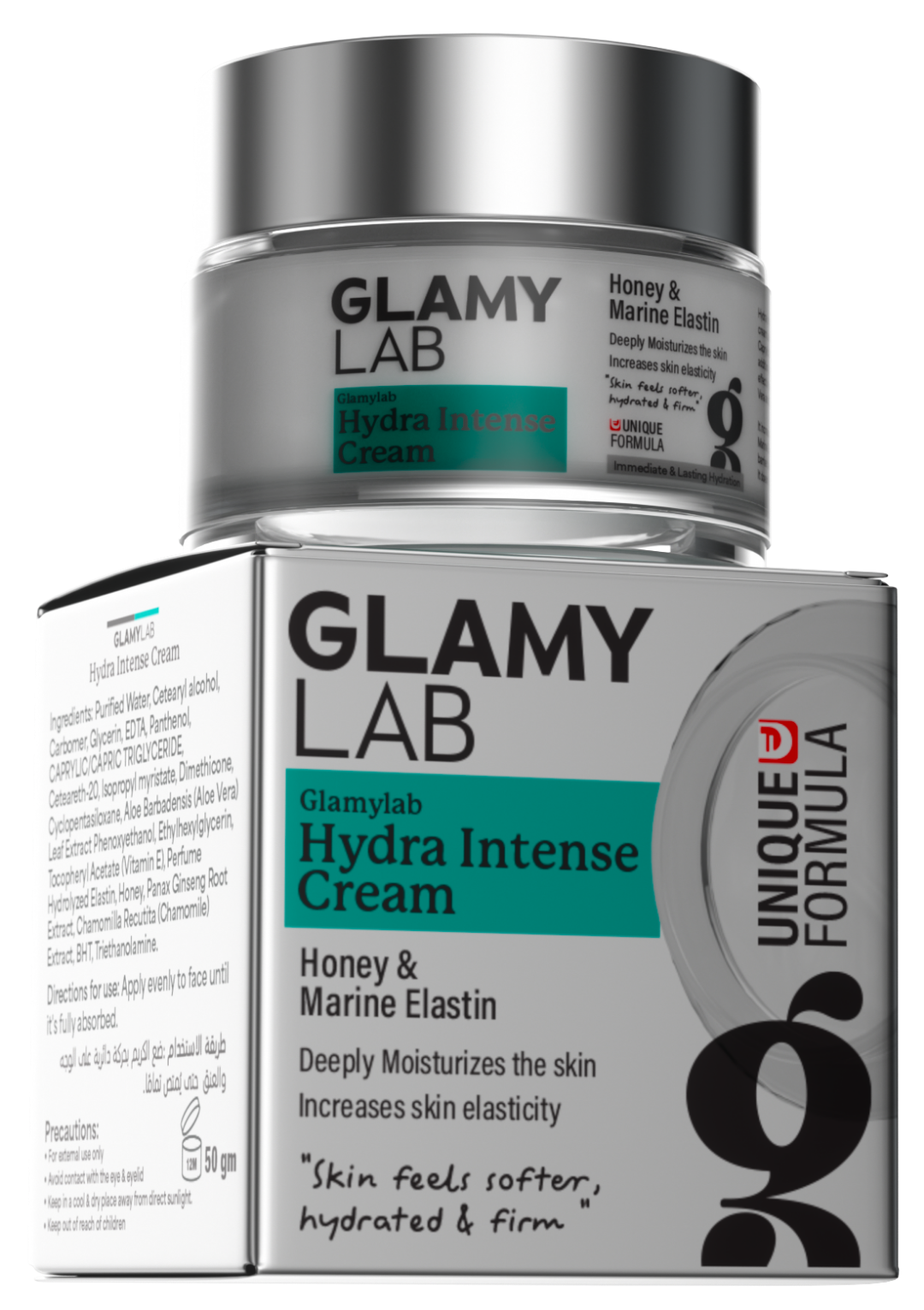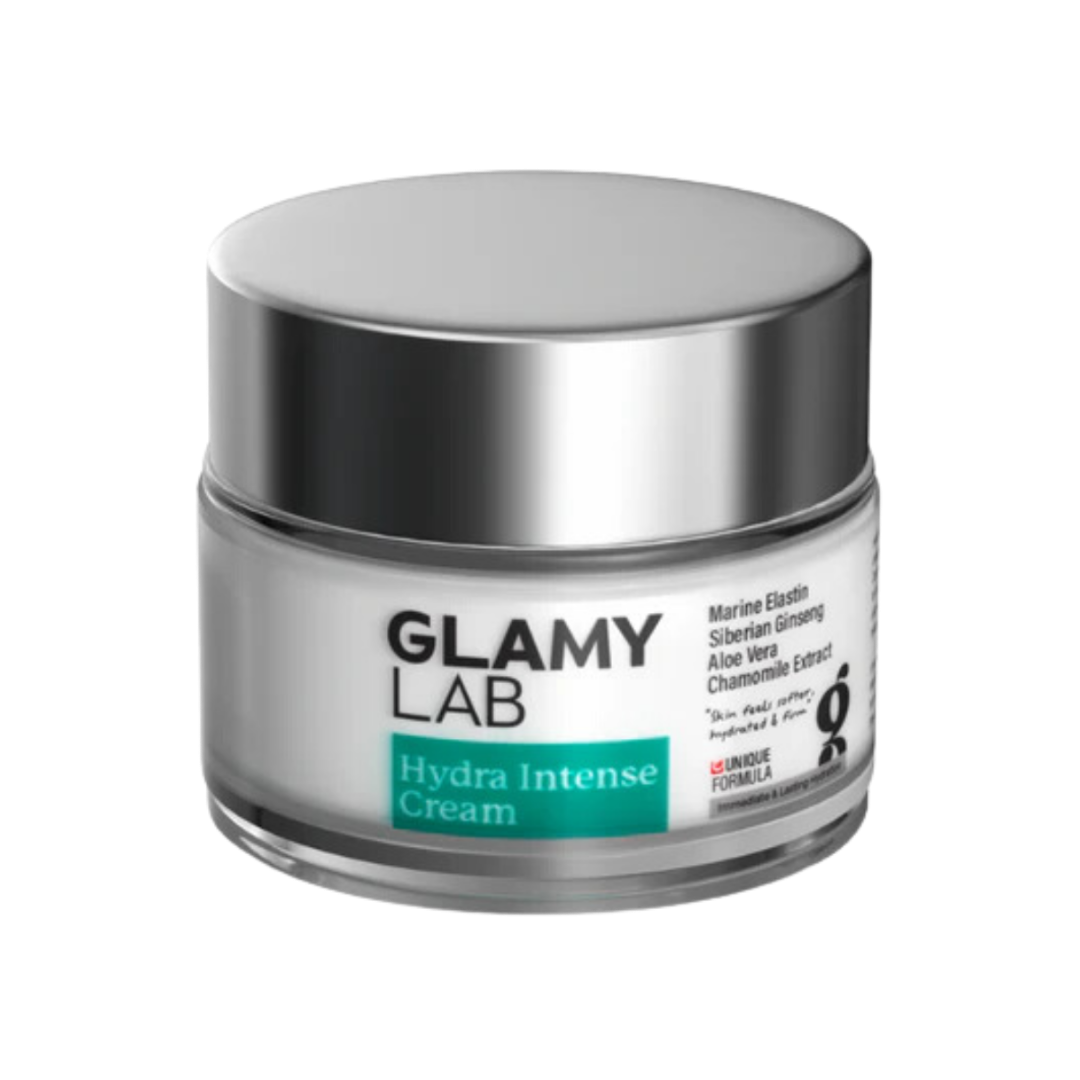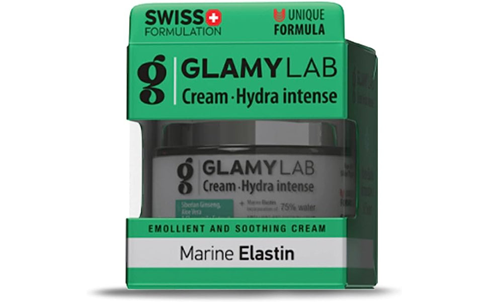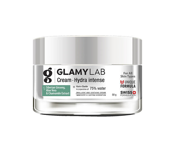 Deeply hydrate and rejuvenate your skin with Glamy Lab Hydra Intense CreamSwiss-formulated with 75% water, marine elastin, Siberian ginseng, honey, aloe, chamomile, & vitaminE for a radiant, firm, and supple complexion.